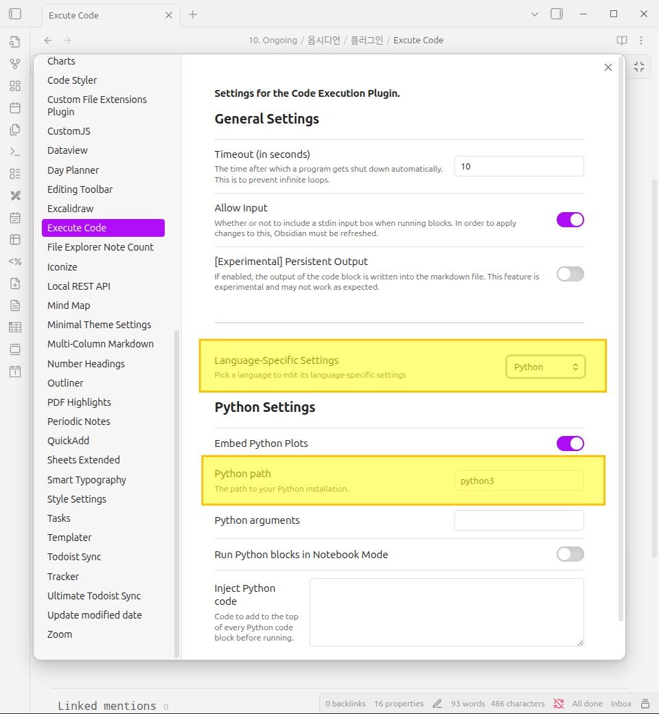 먼저 Excute Code를 설치한다. 설치가 완료되면 옵션에서 필요한 정보를 설정한다. 참고로, 본 플러그인에서 지원하는 프로그래밍 언어는 JavaScript, Python, R, C/C++, Java, SQL, Latex 외 다양하다. 본 글에서는 Python을 기준으로 설명한다.