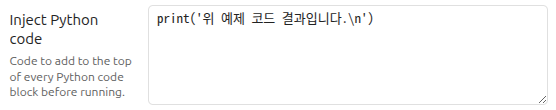 모든 코드블록 상단에 특정 코드를 추가할 수 있다. 옵션에 Insect Python code에 필요한 추가할 내용을 작성한다.