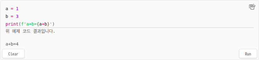 편집모드에서도 작성된 코드를 실행하려면 코드블록 기호(```) 뒤에 run-python을 입력한다.