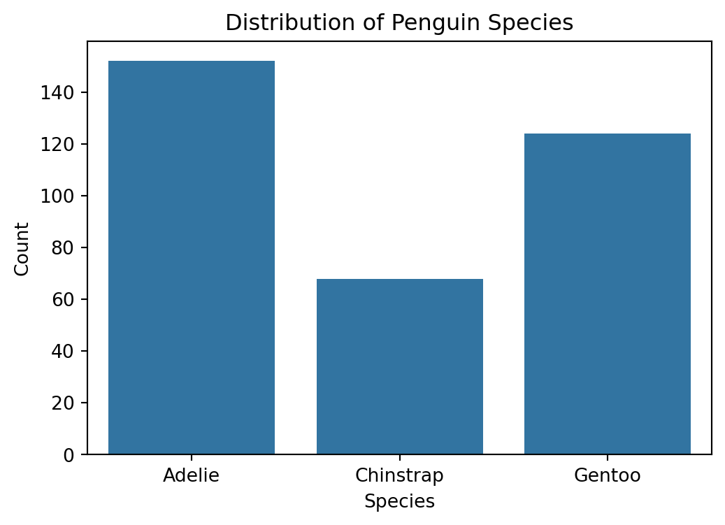 # 종별 분포 막대 그래프plt.figure(figsize=(6,4))sns.countplot(data=df, x="species")plt.title("Distribution of Penguin Species")plt.xlabel("Species")plt.ylabel("Count")plt.show()