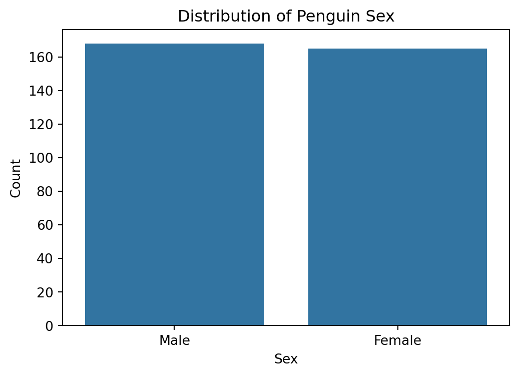# 성별 분포 막대 그래프plt.figure(figsize=(6,4))sns.countplot(data=df, x="sex")plt.title("Distribution of Penguin Sex")plt.xlabel("Sex")plt.ylabel("Count")plt.show()