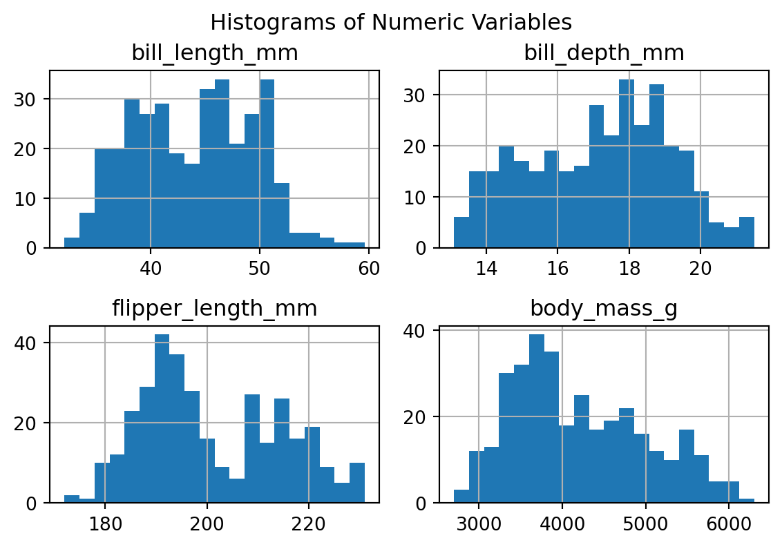 # 모든 수치형 변수의 히스토그램df.hist(bins=20, figsize=(6,4))plt.tight_layout()plt.suptitle("Histograms of Numeric Variables", y=1.02)plt.show()