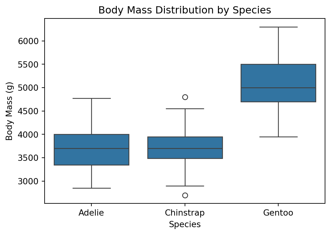 # 종별 체중 분포 박스플롯plt.figure(figsize=(6,4))sns.boxplot(data=df, x="species", y="body_mass_g")plt.title("Body Mass Distribution by Species")plt.xlabel("Species")plt.ylabel("Body Mass (g)")plt.show()