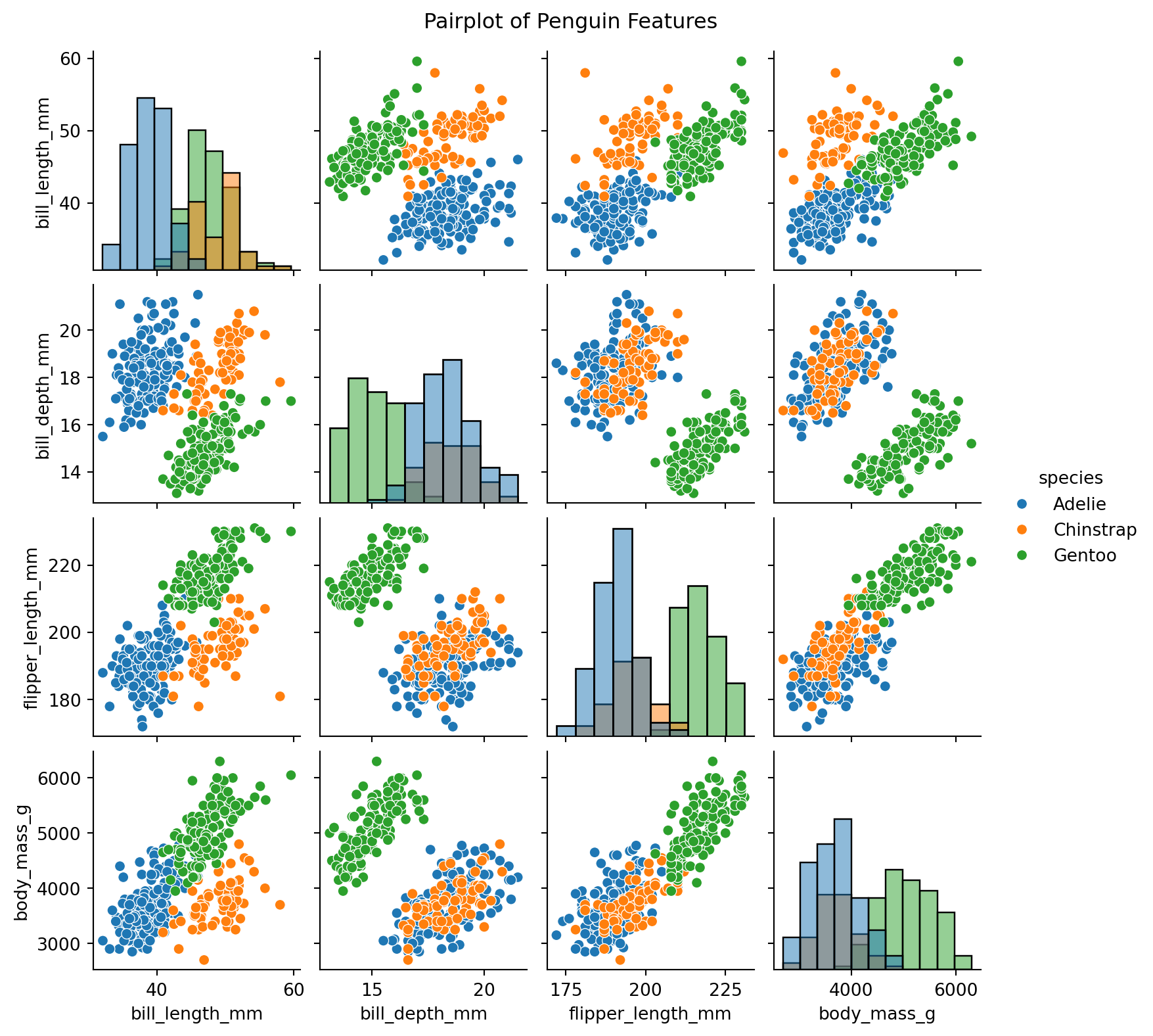 # 모든 수치형 변수 쌍의 관계 시각화sns.pairplot( df, hue="species", diag_kind="hist", height=2)plt.suptitle("Pairplot of Penguin Features", y=1.02)plt.show()