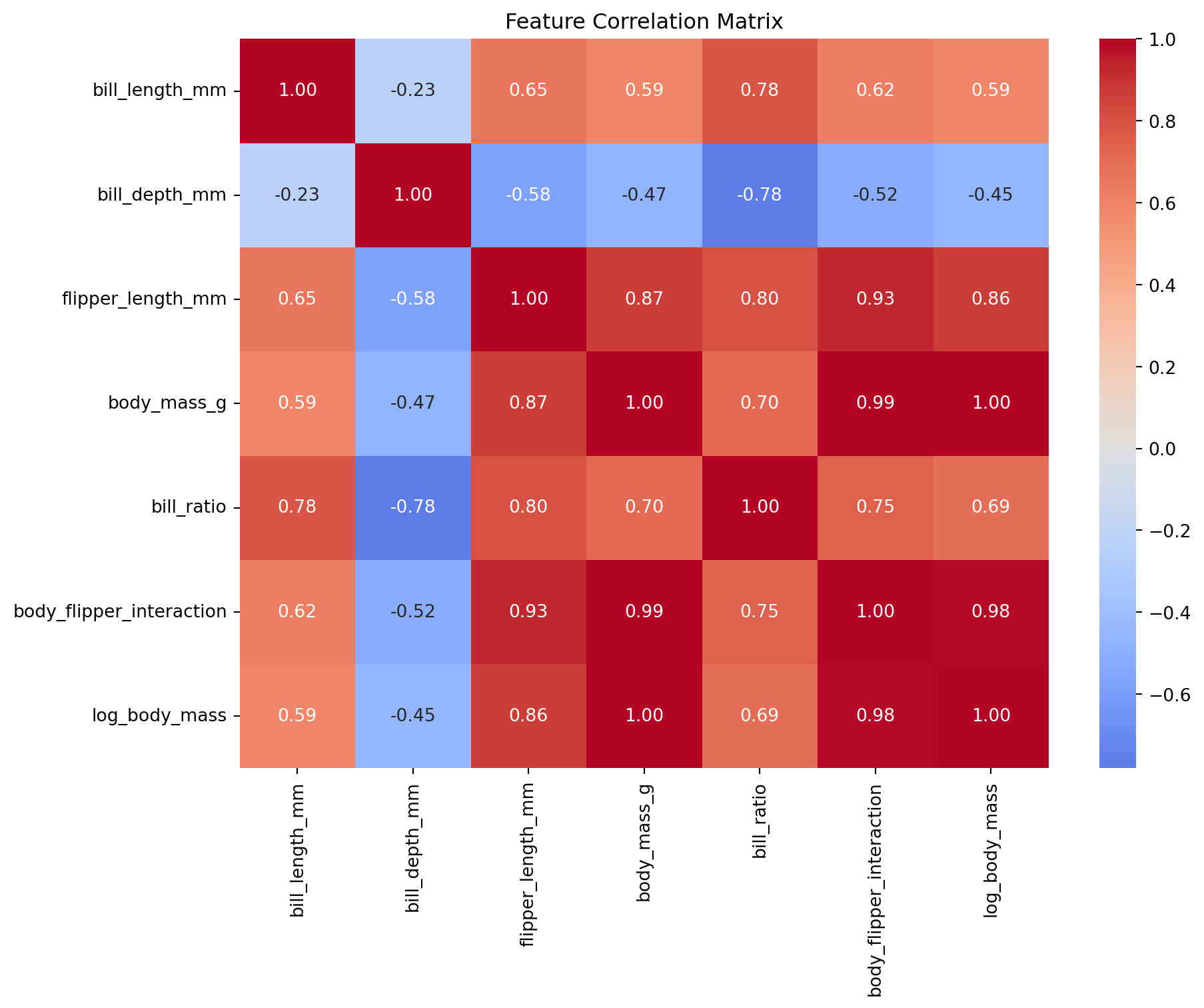 # 체중 대 날개 길이 비율 (체중 효율성)df["body_flipper_ratio"] = df["body_mass_g"] / df["flipper_length_mm"]# 전체 부리 크기 대비 길이 비율df["bill_total"] = df["bill_length_mm"] + df["bill_depth_mm"]df["bill_length_proportion"] = df["bill_length_mm"] / df["bill_total"]print("\n생성된 비율 피처:")print(df[["bill_ratio", "body_flipper_ratio", "bill_length_proportion"]].head())
