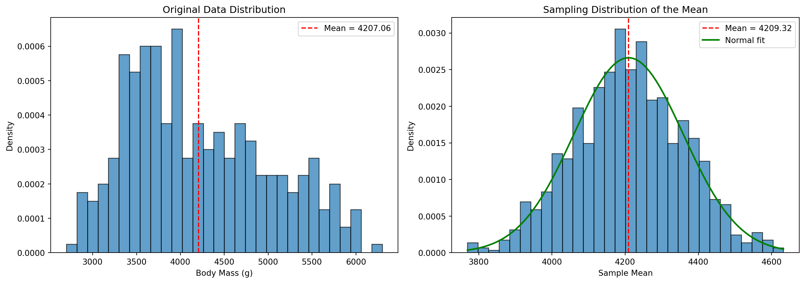 원본 데이터는 극도로 왜곡되어 있지만, 표본 평균의 분포는 정규분포에 매우 가깝다는 것을 확인할 수 있다.